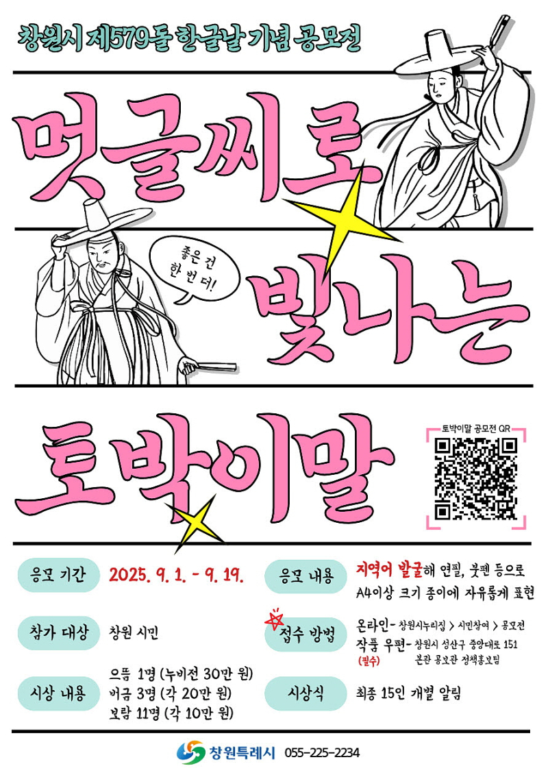 응모 기간은 9월 1일부터 19일까지이며, 온라인 또는 우편 접수가 가능하다. 시는 심사를 통해 15명의 우수 작품을 선정하고, 으뜸 1명 30만원, 버금 3명 각 20만원, 보람 11명 각 10만원을 창원사랑상품권 ‘누비전’으로 시상한다.