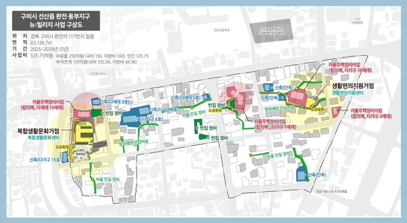 선산 이음센터·산동 힐링센터, 무을 복지회관 리모델링, 장천 한마음센터 등이 추진되며, 선산읍 완전·동부지구는 국토부 ‘뉴:빌리지 사업’에 선정돼 주차장, 다목적광장, 생활문화센터가 들어선다.