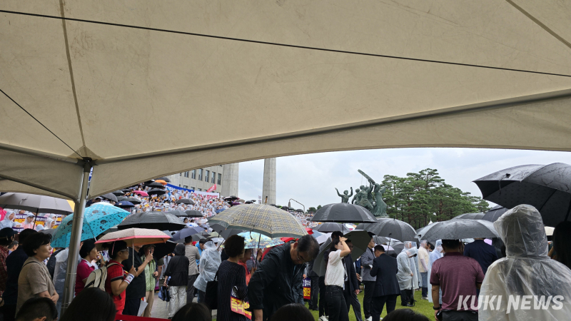 지역구 의원들뿐만 아니라 원외당협위원장들도 지역 당원들과 함께 모여 본관 앞 계단을 넘어 주변을 가득 채웠다. 비가 오는 날씨에 규탄대회가 열려 당 관계자들은 우산을 들고 우비를 챙겨 입었다.