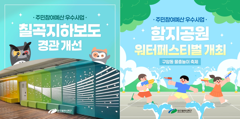 대구시 주민참여예산 우수사업에서 북구의 ‘칠곡지하보도 경관 개선’과 ‘구암동 물총놀이 축제’가 선정됐다.