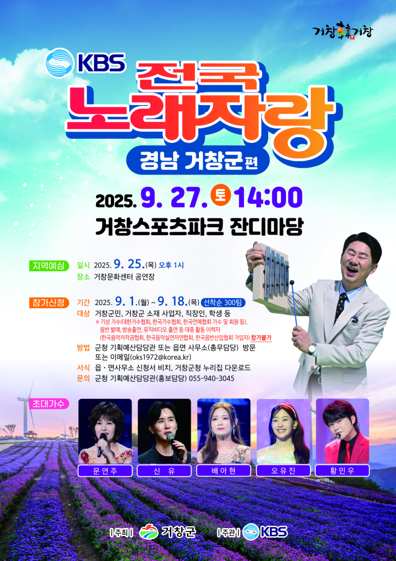 거창군은 9월27일 오후 2시 거창스포츠파크 잔디마당에서 'KBS 전국노래자랑 경남 거창군 편'을 개최한다.