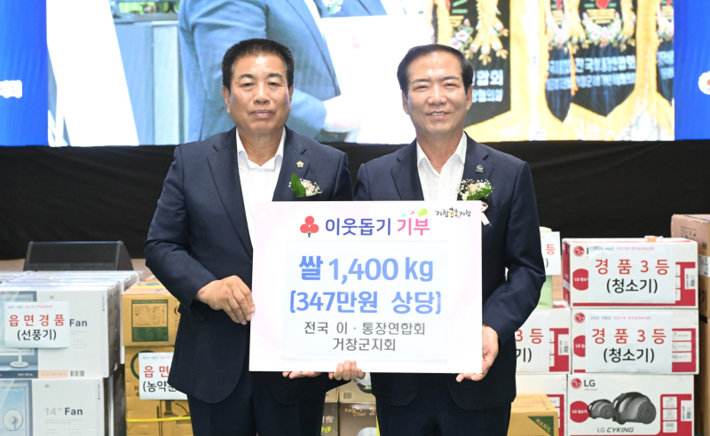 거창군은 지난 1일 거창스포츠파크 다목적체육관에서 열린 2025년 거창군 이장가족 한마음 체육대회에서 전국 이·통장연합회 거창군지회(회장 송강훈)가 축하 화환 대신 쌀을 받아 그 쌀을 기부하며 따뜻한 나눔을 실천했다.