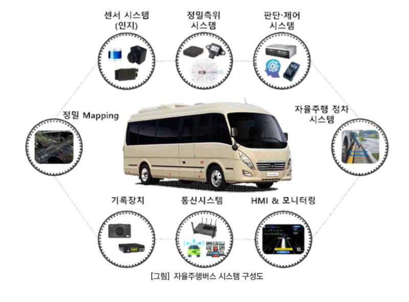 자율주행 버스는 15인승이며 차량 주변 물체·속도·거리 등을 감지하는 레이더, 레이저로 주변 환경의 3차원 정보를 정밀하게 읽는 라이다, 눈 역할을 하는 카메라 등이 장착된 3세대 자율주행 차량으로 운전자가 탑승해 필요할 경우 차량을 수동으로 운전할 수 있다.