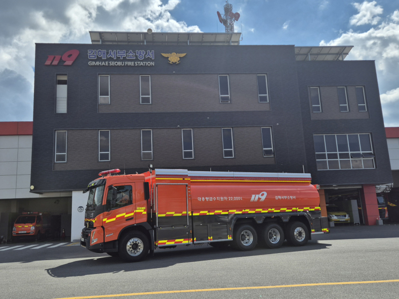 경남 최초 대용량 급수지원차가 8일 김해서부소방서(서장 윤영찬)에 배치되면서 대형 화재 대응력이 크게 향상됐다.