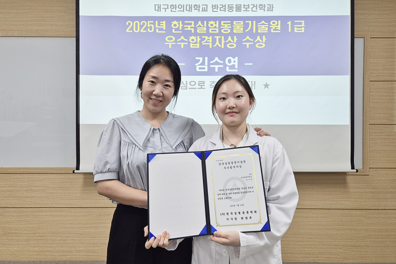 대구한의대학교 반려동물보건학과 졸업생이 국내 최고 난이도의 실험동물기술원 1급 시험에서 우수합격자상을 수상하며 학과의 교육 성과를 입증했다.
