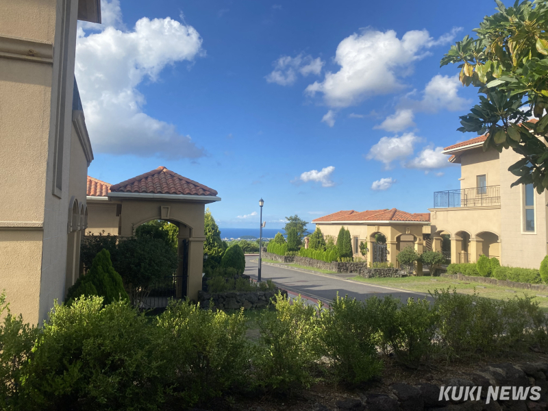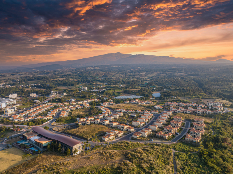 옐로우 톤의 건물과 벽돌색 지붕으로 꾸며진 객실은 모두 독채로 마련돼 있다. 마치 지중해 유럽의 휴양지에 온 듯한 이국적인 분위기를 풍기면서도, 제주의 푸른 하늘과 바다, 그리고 한라산 풍경과 자연스럽게 어울린다. 객실 간 간격이 넓어 프라이빗한 휴식이 가능하고, 창 너머로는 한라산의 능선과 저녁 노을이 그대로 펼쳐진다. 곳곳에 배치된 벤치와 정원은 투숙객에게 잠시 머물러 자연을 들여다보게 한다.