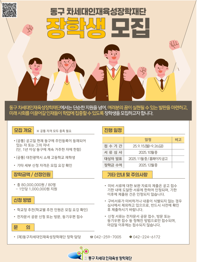 대전 동구, 차세대인재육성장학재단 장학생 80명 모집