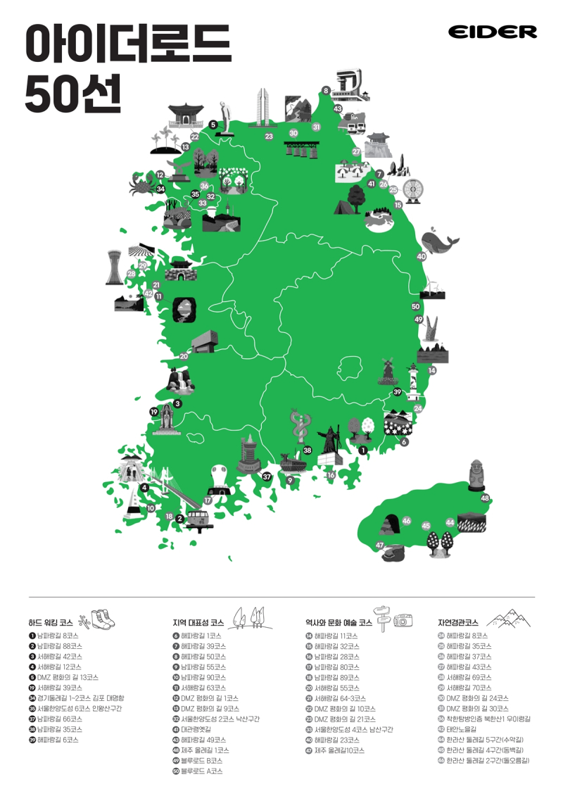 아이더로드 50선은 △지역 대표성 코스(14개) △역사·문화예술 코스(12개) △자연 경관 코스(13개) △하드 워킹 코스(11개) 등 네 가지 테마로 구성됐다. 초보자부터 숙련자까지 누구나 즐길 수 있도록 난이도와 성격을 다양화한 것이 특징이다.