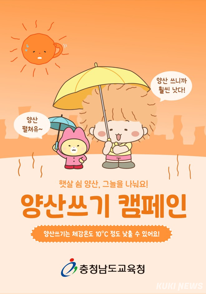 충남교육청이 여름철 폭염으로부터 직원들의 건강을 보호하기 위해 지난 7월부터 시행하고 있는 ‘햇살 쉼 양산 펼쳐유’ 참여형 나눔 캠페인을 펼쳐 직원들로부터 큰 호응을 얻고 있다. 양산쓰기 캠페인 알림그림. 충남교육청은 여름철 폭염으로부터 직원들의 건강을 보호하기 위해 지난 7월부터 시행하고 있는 ‘햇살 쉼 양산 펼쳐유’ 참여형 나눔 캠페인이 직원들로부터 큰 호응을 얻고 있다.