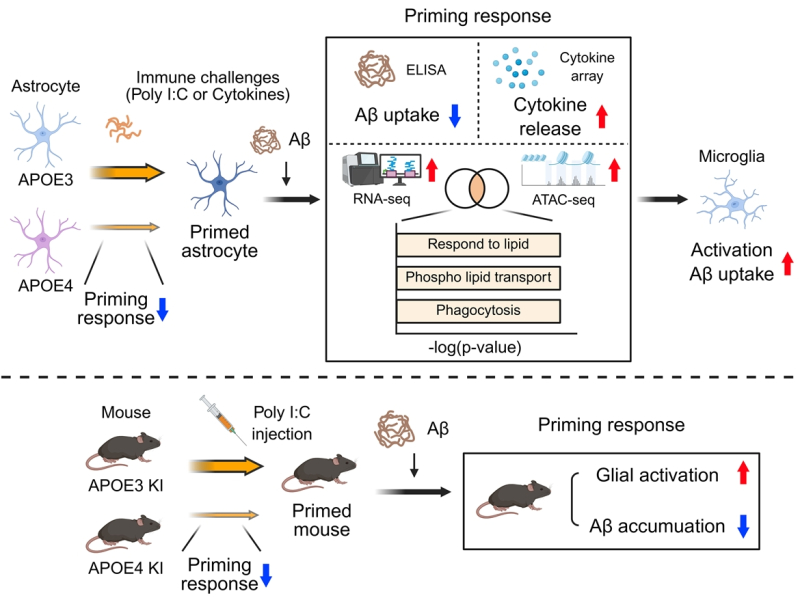 그러나 알츠하이머병의 가장 강력한 위험인자 ‘APOE4’ 유전형을 가진 경우 성상교세포의 면역기억 형성이 대조군 ‘APOE3’에 비해 뚜렷이 저하되고, 그 결과 미세아교세포의 식균작용이 떨어져 아밀로이드베타가 더 많이 축적됐다.