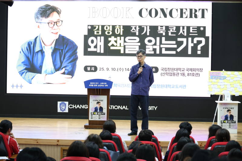 김영하 작가가 국립창원대학교 도서관에서 북콘서트를 갖고 독서의 인문학적 성찰이 담긴 '왜 책을 읽는가' 강연을 개최했다. 12일 열린 이번 행사는 사전 신청을 통해 학내 구성원과 지역 주민 등 300여명이 참석했다.