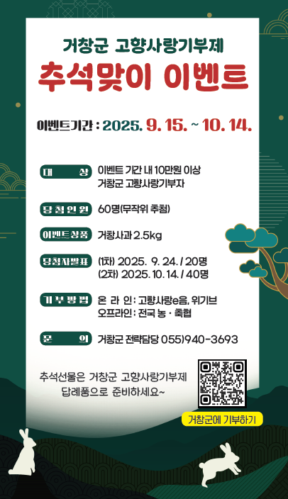 거창군은 추석 맞이해 9월15일부터 10월14일까지 거창군 고향사랑기부제 기부자를 대상으로 추석맞이 이벤트를 한다.