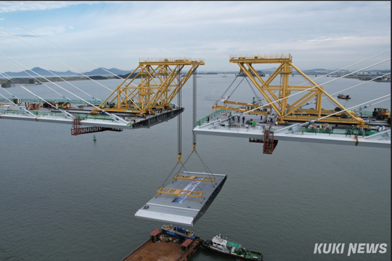 인천경제자유구역청은 15일 서해바다를 가로질러 중구 중산동과 서구 청라동을 잇는 제3연륙교의 마지막 상판이 연결 공사가 완료됐다고 밝혔다.