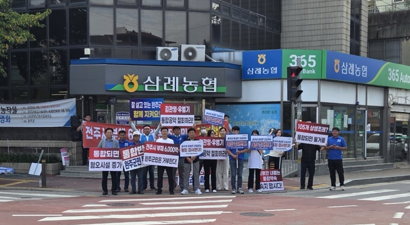 전북 완주군의회 유의식 의장과 이경애 의원이 15일 삼례농협 일원에서 출근길 주민을 대상으로 완주·전주 통합 반대 캠페인을 통해 강력한 반대 의지를 밝혔다.