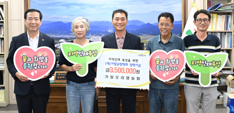 도내 오리 사육 1위를 차지하고 있는 거창오리영농회는 회원 26명으로 구성되어 2018년부터 꾸준히 장학금을 꾸준히 기탁해 왔고 올해는 전년보다 50만 원을 늘려 350만원을 기탁했다. 서인성 회장은 “어려운 학생들이 경제적 부담을 느끼지 않고 학업에 매진할 수 있도록 기탁금을 써달라고” 전했다.