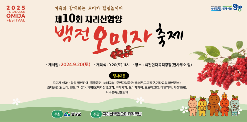 함양군 백전면에서 지역 대표 특산물인 오미자를 주제로 한 '제10회 지리산함양 백전오미자축제'가 9월20일 백전면 다목적광장에서 개최된다.