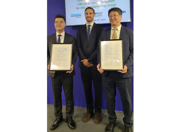 케이조선은 11일(현지시간) 이탈리아 밀라노에서 열린 세계 최대 가스 전시회 ‘가스텍(Gastech)’에서 노르웨이선급(DNV)으로부터 18K LNG 벙커링선(LBV) 기본설계 인증(AIP)을 획득했다. 이번 설계는 케이조선과 동화엔텍이 공동으로 진행했다.