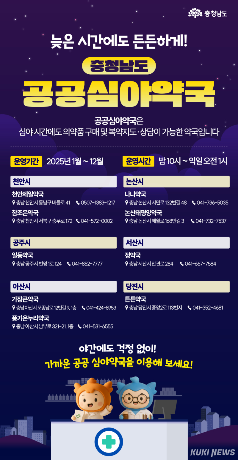 도내 공공심야약국은 이번에 신규 지정된 공주시 1곳을 포함해 천안 2곳, 아산 2곳, 서산 1곳, 논산 2곳, 당진 1곳 등 총 9곳으로 늘었다.