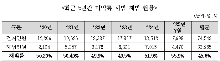 올해 상반기 마약류 사범 재범률이 55.9%에 달하면서 현행 마약 치료·재활 시스템의 실효성을 점검하고 회복 지원체계를 새롭게 구축해야 한다는 지적이 나왔다.
