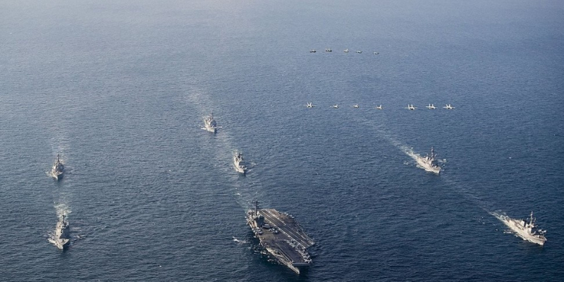 앞서 미 인도태평양사령부는 “3국의 지속적인 협력은 공통의 위협에 대응해 제1도련선 내 신뢰성 있는 전력을 강화함으로써 아시아태평양 지역의 억지력을 제고한다”고 밝혀 훈련이 중국의 해양 진출을 견제하는 성격임을 드러냈다. 그러나 북한의 반발이 고려됐다는 분석도 제기된다. 북한은 훈련 직전 담화를 통해 “맞대응 행동을 보다 강도 높게 표현할 것”이라고 위협했지만, 항모 불참으로 도발 명분이 약화됐다는 평가가 뒤따른다.