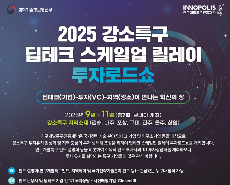 연구개발특구진흥재단(이하 특구재단)은 오는 30일부터 오는 11월까지 전국 순회 ‘2025 강소특구 딥테크 스케일업 릴레이 투자로드쇼’를 개최한다.