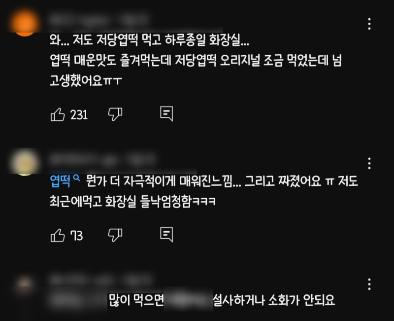 실제 SNS·블로그·유튜브 등에는 “먹고 나서 장이 불편했다”, “매운맛 때문인 줄 알았는데 알고 보니 대체당 때문이었다”는 소비자 후기가 올라왔다. 한 유튜버는 “화장실을 8번 다녀왔다”고 전하기도 했다.