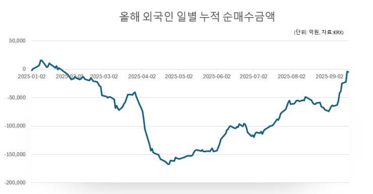 17일 한국거래소(KRX)에 따르면 9월 들어(1~17일) 유가증권 시장에서 외국인 누적 순매수 규모(NTX제외)는 약 6조6900억원이다. 이 기간 지수는 8.6%의 상승률을 기록했다. 같은 기간 개인은 9조원을 순매도, 기관은 1조7400억원 순매수를 보였다.