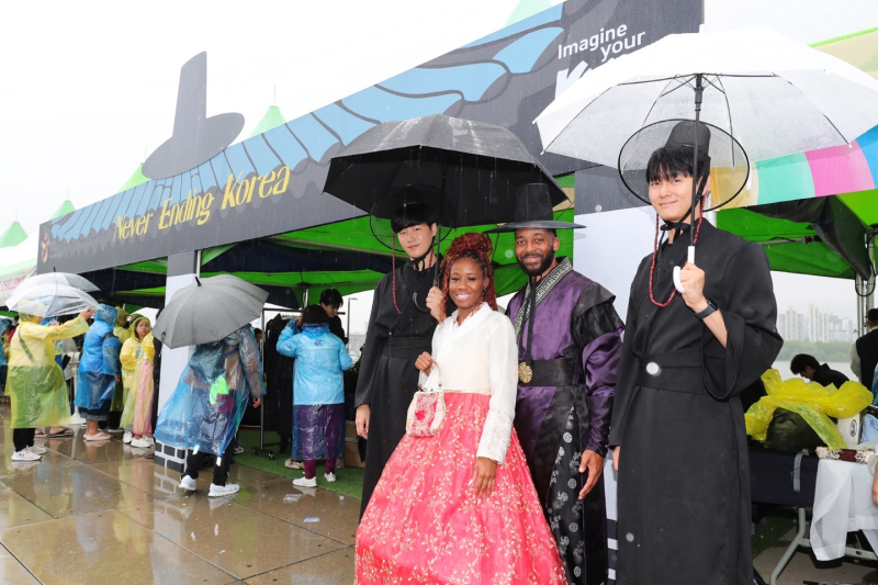 폭우에도 끄떡없다. 세찬 빗줄기 소리보다 한강을 메운 관광객들 웃음소리가 더 컸다. 폭우 속에서도 관광객들은 우비를 걸친 채 콘텐츠를 즐기고 전통놀이에 참여하며 축제를 즐겼다.