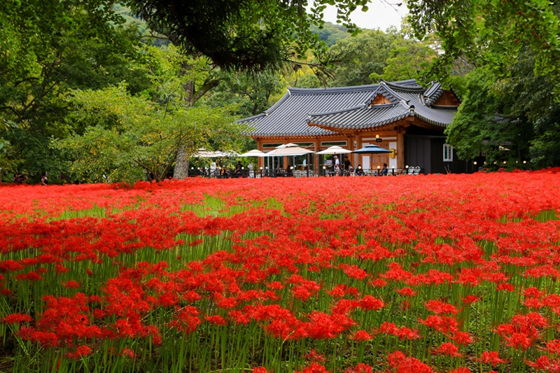 꽃무릇은 꽃과 잎이 서로 다른 시기에 피는 식물로 ‘만날 수 있는 인연’을 상징, 붉게 물든 꽃밭 속을 거닐면 낭만적인 감상에 젖어든다.