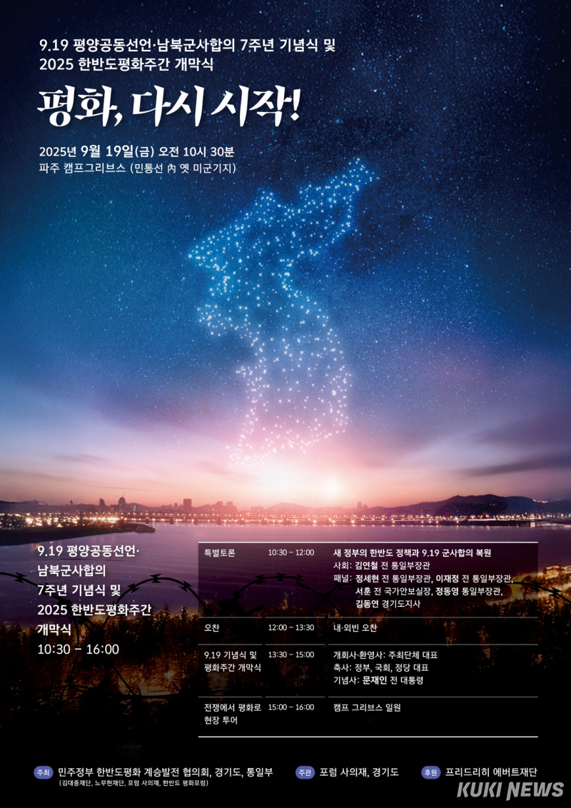 경기도와 통일부, 민주정부 한반도평화 계승발전협의회가 공동으로 주최하고 프리드리히 애버트 재단이 후원하는 ‘9·19 평양공동선언 7주년 기념행사’가 19일 오전 10시30분 파주 캠프그리브스에서 열린다.