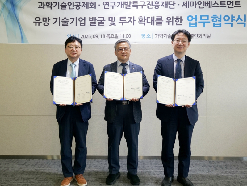 연구개발특구진흥재단(이하 특구재단)은 과학기술인공제회, 세마인베스트먼트㈜와 (대표이사 황치연, 이하 ‘세마인베’)와 ‘유망 기술기업 발굴 및 투자 확대를 위한 업무협약’을 18일 체결했다.