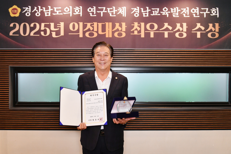경상남도의회 권원만 의원(국민의힘, 의령)이 소속된 의원연구단체 ‘경남교육발전연구회’가 최근 열린 법률저널 주최 ‘2025 지방의정대상’ 시상식에서 정책연구 부문(광역의회) 최우수상을 수상했다.