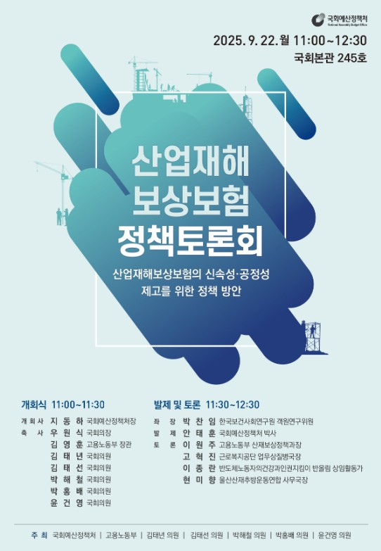 발제는 안태훈 국회예산정책처 박사가 맡아 산재보험 제도의 주요 개선 과제를 제시한다. 이어 이원주 고용노동부 산재보상정책과장, 고혁진 근로복지공단 업무상질병국장, 이종란 반올림 상임활동가, 현미향 울산산재추방운동연합 사무국장이 토론에 참여해 각 현장의 목소리를 전할 예정이다. 특히 산재피해를 직접 다뤄온 시민단체가 참여해 실질적인 현장 경험이 담긴 의견이 제시될 전망이다.