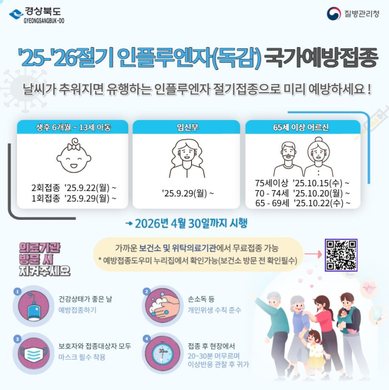 경북도는 겨울철 인플루엔자 유행에 대비해 고위험군을 대상으로 ‘2025년~2026년 절기 인플루엔자 국가 예방접종’을 실시한다고 21일 밝혔다.