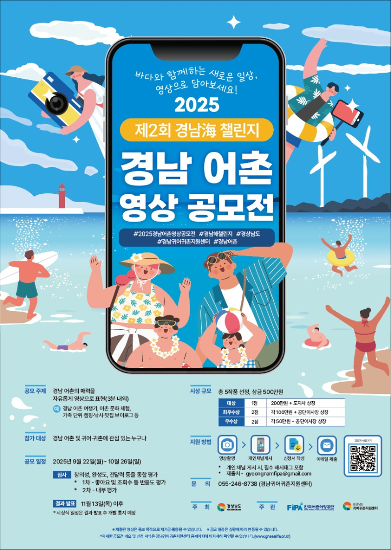 공모전 주제는 ‘경남 바다와 어촌의 일상’으로 3분 이내의 영상에 바다 풍경, 어촌 주민들의 일상, 전통어업과 체험 현장, 지역 문화 등을 담아 제출하면 된다.