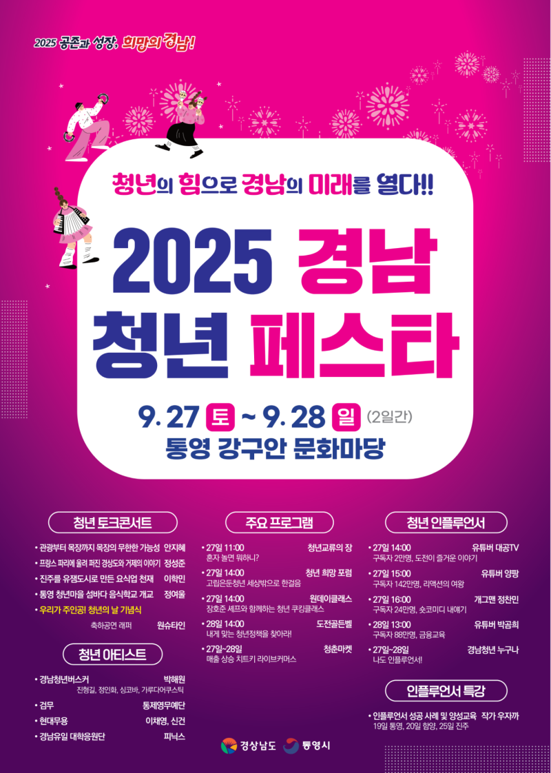 경상남도가 청년의 날과 청년주간을 맞아 오는 9월 27일부터 28일까지 통영 강구안 문화마당 일원에서 '2025 경남청년페스타'를 개최한다.