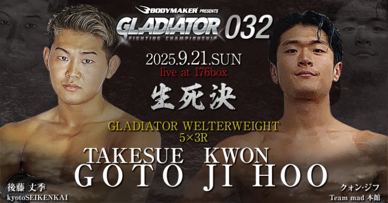 권지후는 2025년 7월 역시 일본 오사카에서 치러진 Wardog Cage Fight 53을 통해 프로 첫 시합을 뛰었다. 2라운드 리어네이키드 초크로 우에다 켄토를 제압한 기세를 이어가길 원한다. 킥복싱 20승 1패가 말해주듯 타격도 좋다. 고토 타케스에는 2023년 10월 이후 워독 1승 및 글래디에이터 3승이다. 아마추어 포함 종합격투기 선수로서 외국인과 첫 대결인 만큼 권지후를 꺾어 5연승을 달성하겠다는 각오가 남다르다.