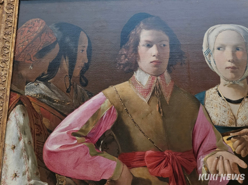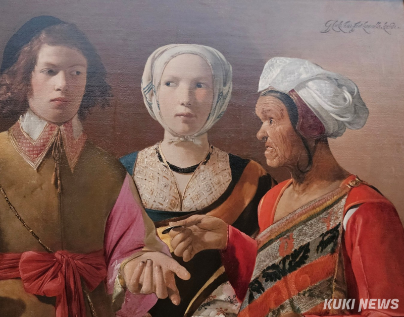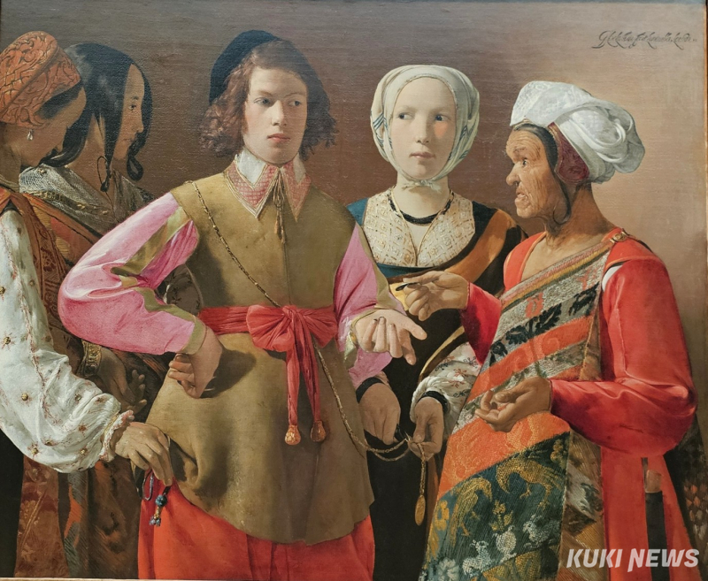 쏜살같이 움직이는 눈동자와 분주한 손길은 차분한 인물들 사이에서 매혹적인 서사를 만들어낸다. 이는 17세기 북유럽에서는 판화로, 로마에서는 카라바조의 추종자들에 의해 대중화된 소재였다. 이 그림에서 시선의 교차와 몸짓의 안무는 젊은 남성이 노파 점쟁이와 패거리들에게 둘러 쌓여 있다는 것을 드러낸다. 인물들의 구도는 극적인 정경을 암시하고 있어 관람자를 그림 속 이야기로 유혹하고 있다.