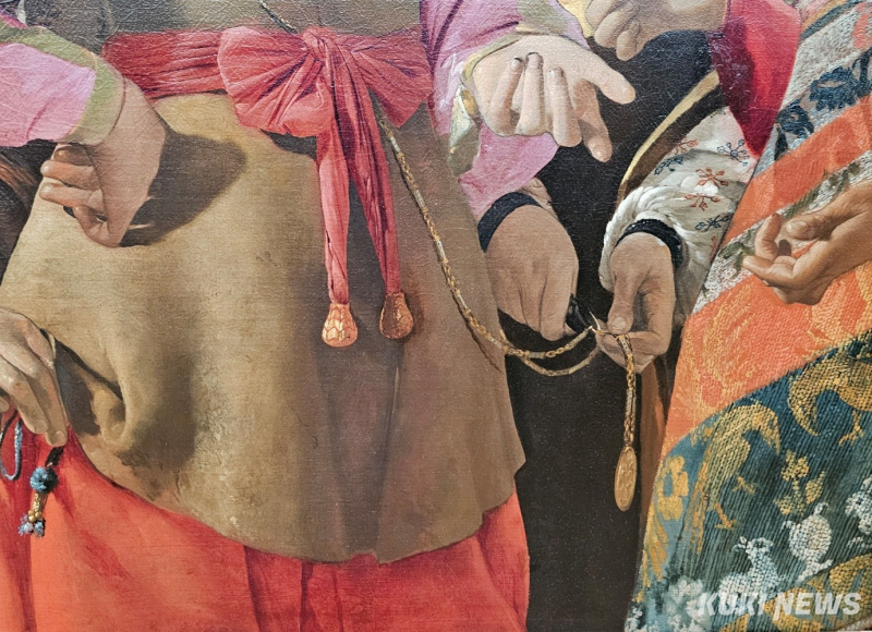 남자의 바지에서 돈주머니를 꺼내는 가장 왼편에 있는 여자부터 스카프를 쓴 여인까지 네 사람의 얼굴의 밝기는 점점 크리센도(crescendo)로 치닫는다. 젊은 남자의 얼굴을 코를 경계로 좌우로 나눠보자. 빛은 왼쪽에서 들어와 왼쪽 머리부터 금발, 목을 덮은 칼라에서 어깨를 타고 분홍색 소매까지 가죽 더블릿에 팔과 손의 그림자를 남기고 있다.
