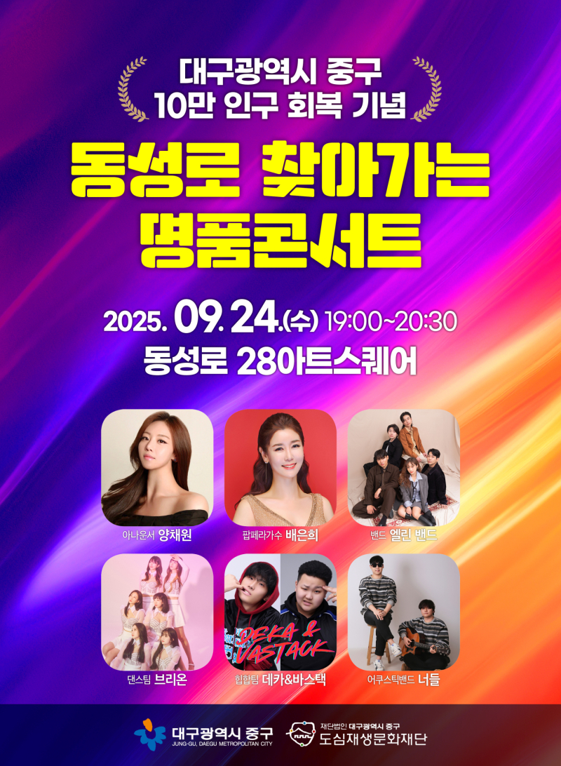 이번 공연은 누구나 현장에서 무료로 관람할 수 있으며, 실황은 ‘대구중구문화재단TV’ 유튜브 채널을 통해 다시 볼 수 있다.