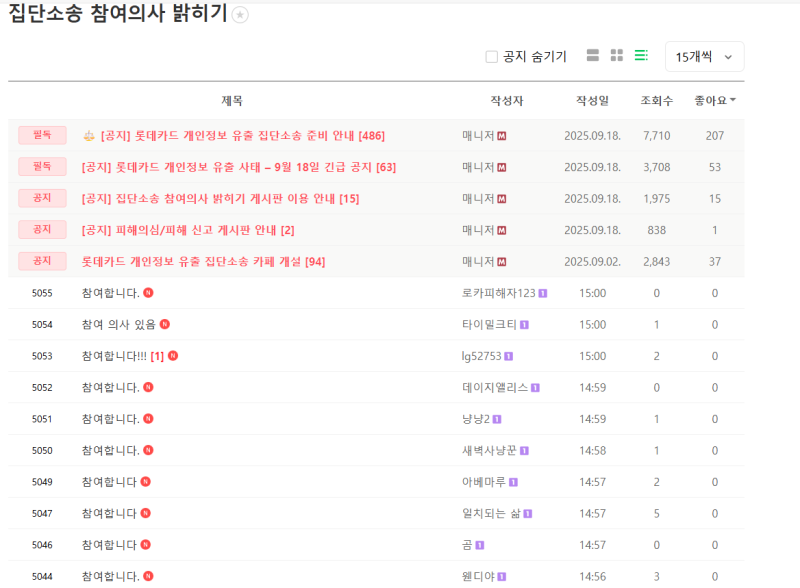 22일 오후 3시 기준, 이달 2일 개설된 ‘롯데카드 개인정보 유출 집단소송 카페’에서 소송 참여 의사를 밝힌 인원은 5000명을 넘어섰다. 해킹 피해 사실이 알려진 이달 초(5일)까지만 해도 100여명에 불과했지만 불과 2주 만에 50배 이상 늘어났다. 이날 하루에만 1000명 넘는 인원이 소송 참여 의사를 밝혔다.