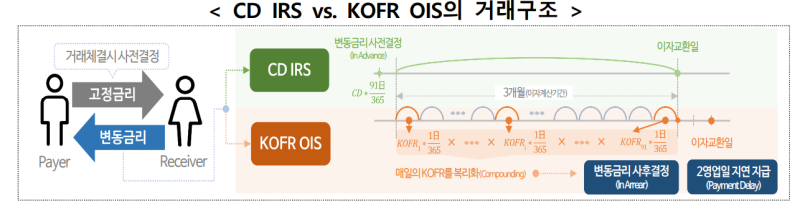 KOFR OIS도 거래 구조는 이와 같지만 KOFR(익일물)을 일 복리해 변동금리를 계산하는 것이 가장 큰 차이다.