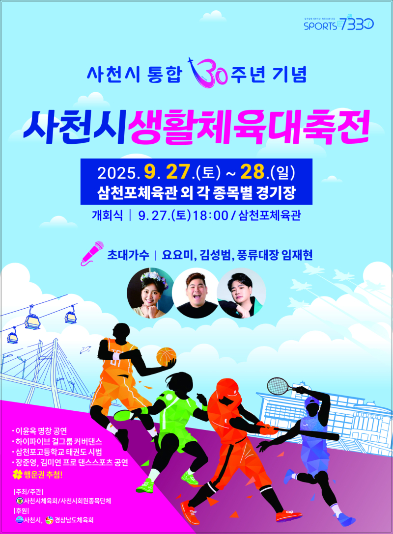 또한, 사천출신 가수 김성범과 트롯가수 요요미, 풍류대장 임재현, 프로 댄스스포츠 선수 장준영·김미연 등이 출연해 통합 30주년 퍼포먼스와 함께 시민 모두가 즐길 수 있는 축하의 장을 연출한다.