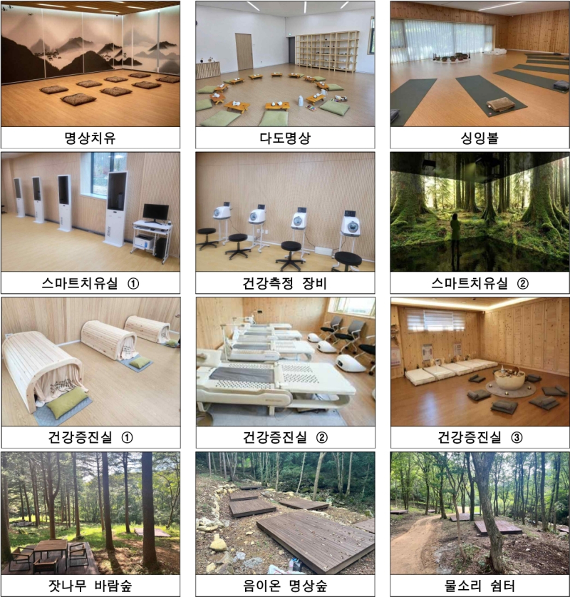 또 실내에는 명상치유, 다도명상, 싱잉볼 프로그램 시설을 갖췄고, 온열치유장비를 갖춘 건강증진실, 첨단장비를 활용한 스마트치유실, 미디어아트 실내 숲도 운영한다.