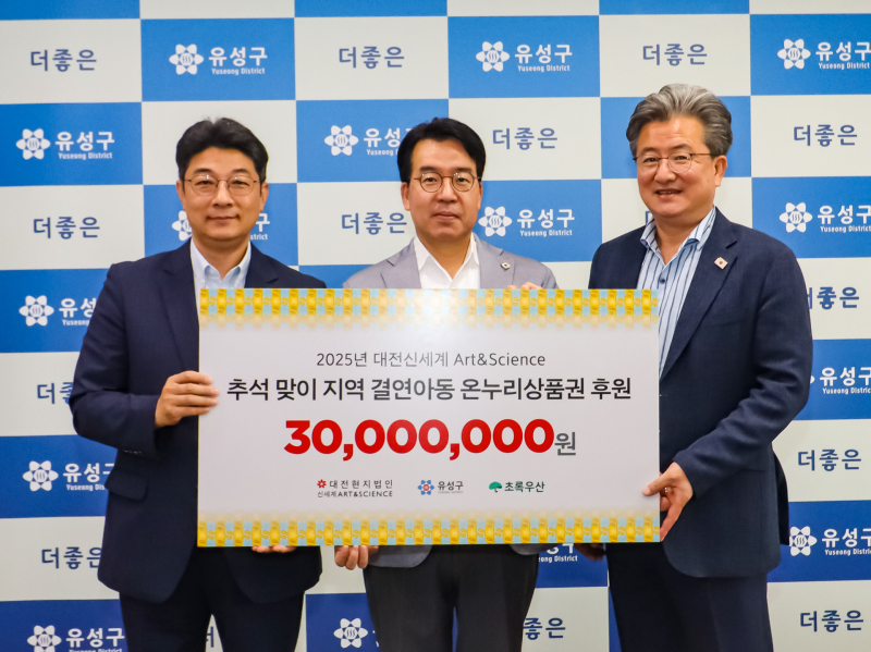 대전신세계 Art & Science는 24일 오전 유성구청에서 온누리상품권 3000만원을 기탁했다. 기탁식에는 윤석희 대전신세계 대표이사, 정용래 유성구청장, 최승인 초록우산 대전지역본부 충청권총괄본부장 등이 참석했다.