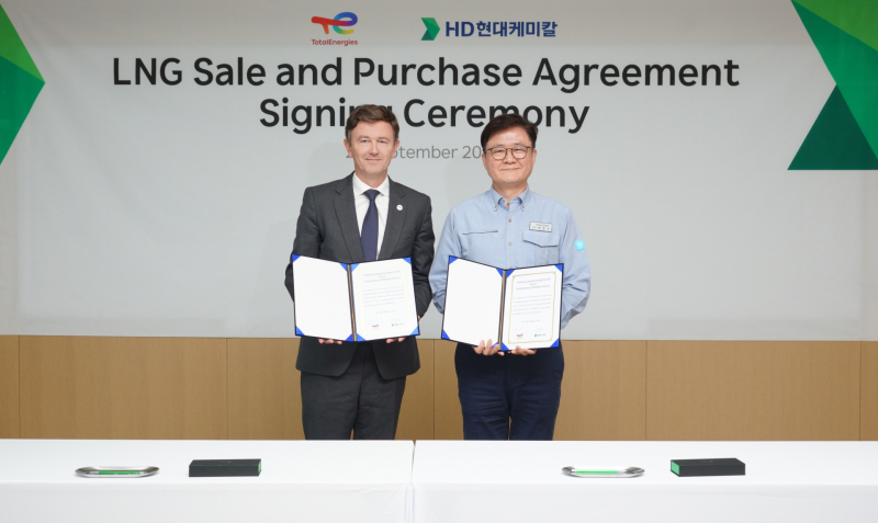 HD현대케미칼은 프랑스 종합 에너지 기업인 ‘토탈에너지스(TotalEnergies)’와 LNG 장기 직도입 계약을 체결했다고 24일 밝혔다. 충남 대산 본사에서 진행된 계약식에는 정임주 HD현대케미칼 대표와 로난 베스컨드(Ronan Bescond) 토탈에너지스 부사장 등 양사 주요 관계자들이 참석했다. 국내 석유화학 기업이 글로벌 기업과 계약을 맺고 해외 LNG 직도입에 나선 것은 이번이 처음이다.