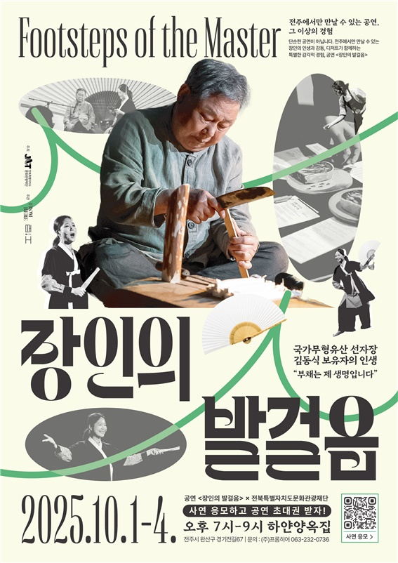 한편 ‘장인의 발걸음’은 다음달 1~4일 총 4차례에 걸쳐 오후 7~9시 전주한옥마을 하얀양옥집에서 열린다. 공연 90분, 인터뷰 30분으로 구성된 국가무형유산 선자장 김동식 보유자의 인생과 기술을 담은 종합 공연으로 로컬 음료와 디저트가 함께 제공된다. 이번 공연은 프롬히어가 주관하며, 전북문화관광재단이 주최한다.