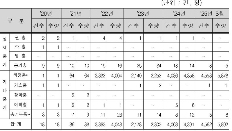 정 의원은 “지난 7월 인천 송도에서 발생한 사제총기 사망사건은 불법 총포류 관리의 허점을 드러낸 대표적 사례”라며 “세관에서 적발된 총기류가 단순 소지 차원을 넘어 사제총기 제작부품으로 악용될 수 있어 위험은 훨씬 더 심각하다”고 지적했다.