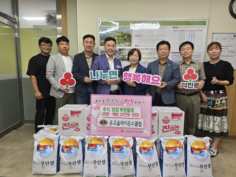 이미영 덕진동장은 “꾸준히 나눔의 정신을 실천하는 온고을 라이온스클럽 회원들에게 감사드린다”며“후원해주신 물품은 관내 취약가구에 잘 전달하고, 어려운 이웃을 더욱 세심하게 살피겠다”고 전했다.