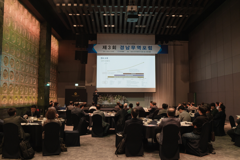 한국무역협회 경남지역본부와 경남기업협의회는 25일 그랜드머큐어앰배서더 창원 호텔에서 ‘스마트 제조의 ROI: 현장에서 바로 쓰이는 산업 AI 전략’을 주제로 제3회 경남무역포럼을 개최했다.